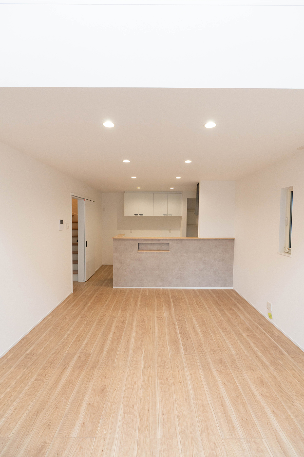 白を基調としたリビングに、キッチンの腰壁に施されたグレーがおしゃれなアクセントに。