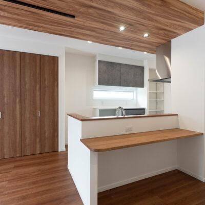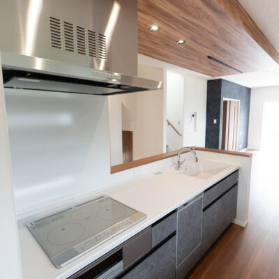 木の温もりと落ち着いたグレーが調和するキッチン。