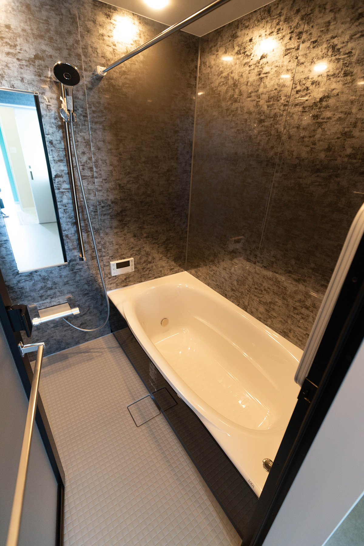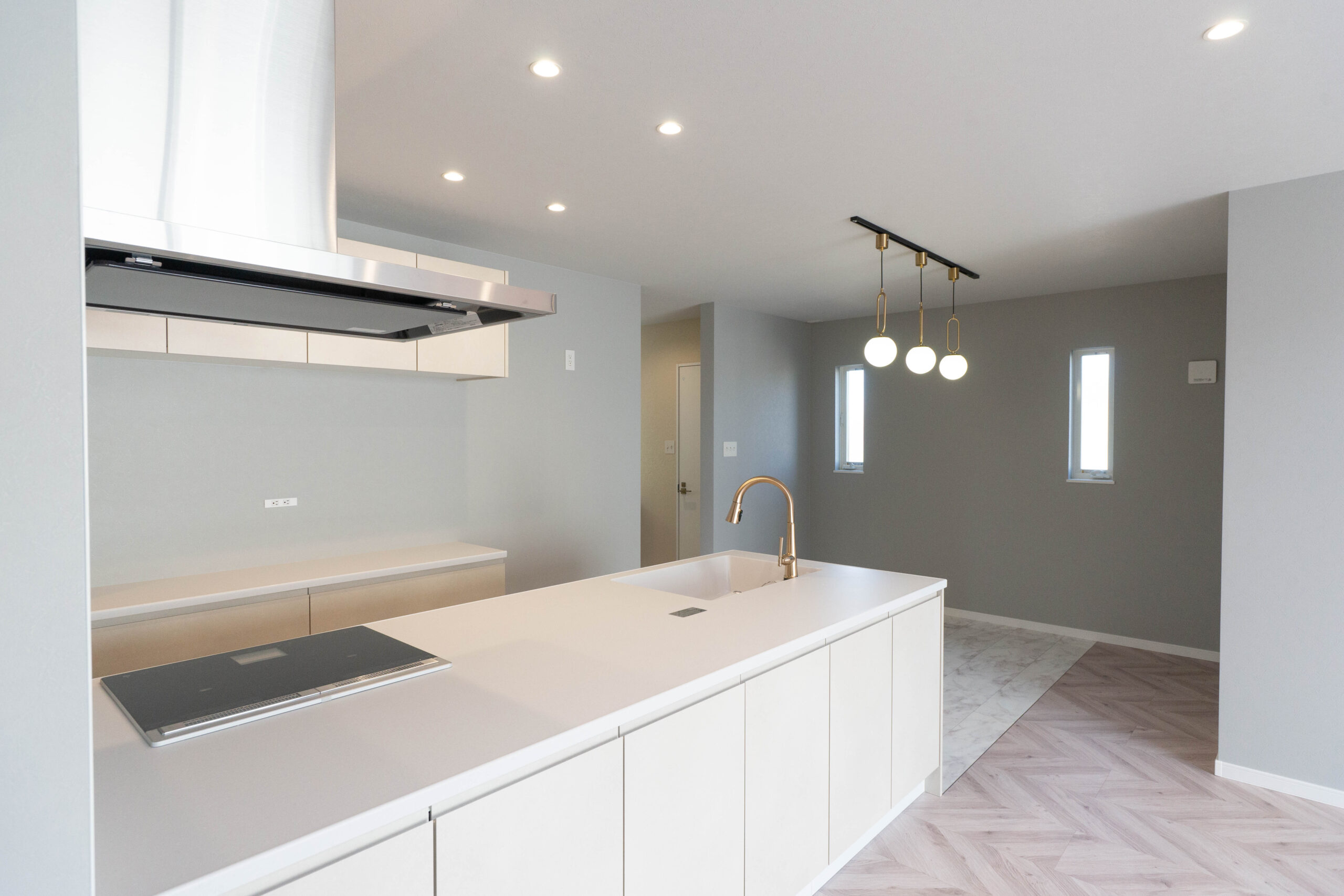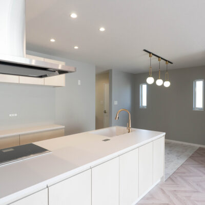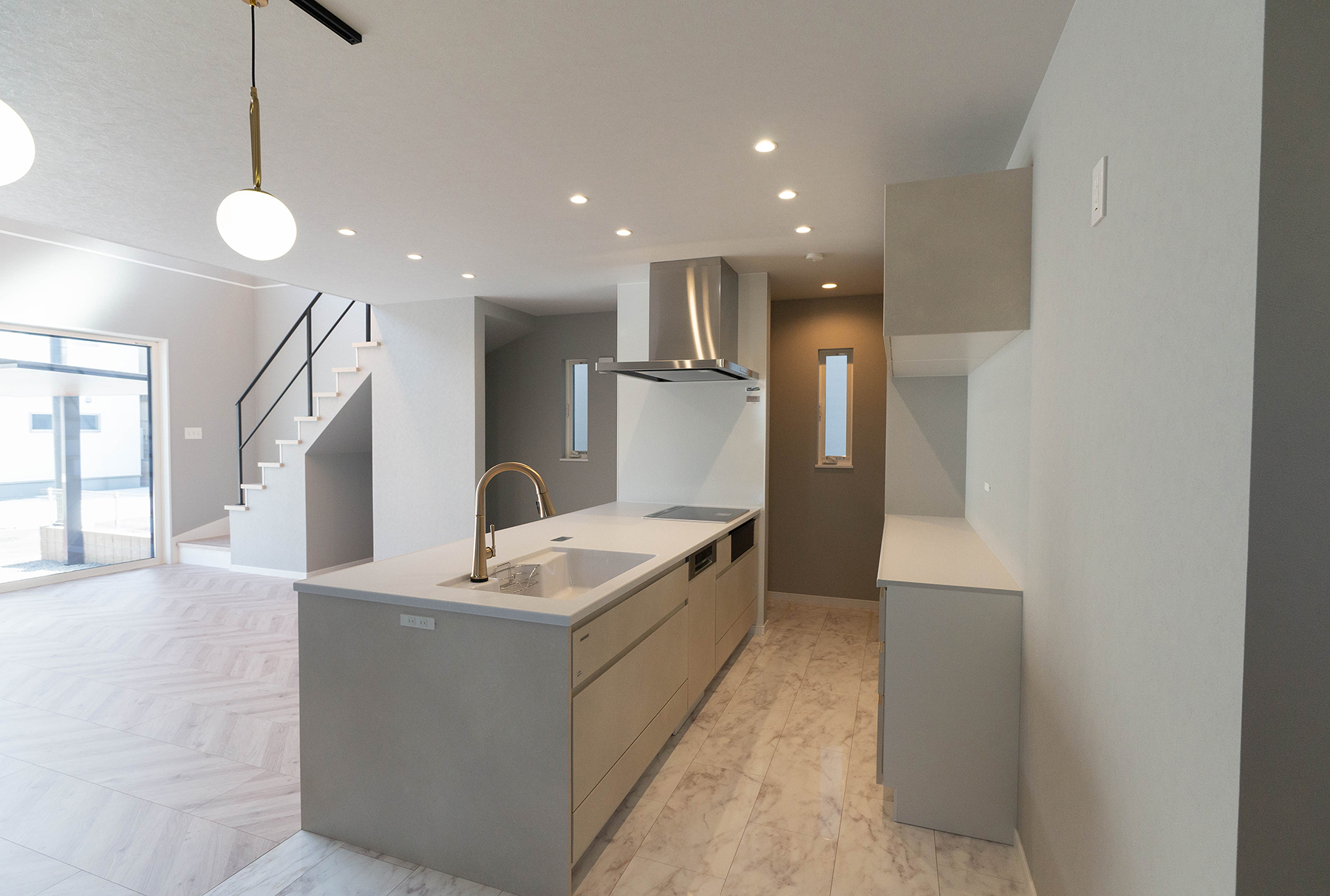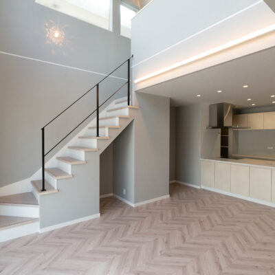 ニュアンスカラーで統一された壁面と、表情豊かなヘリンボーンの床が調和したゴールドのアクセントが光る洗練されたデザイン。