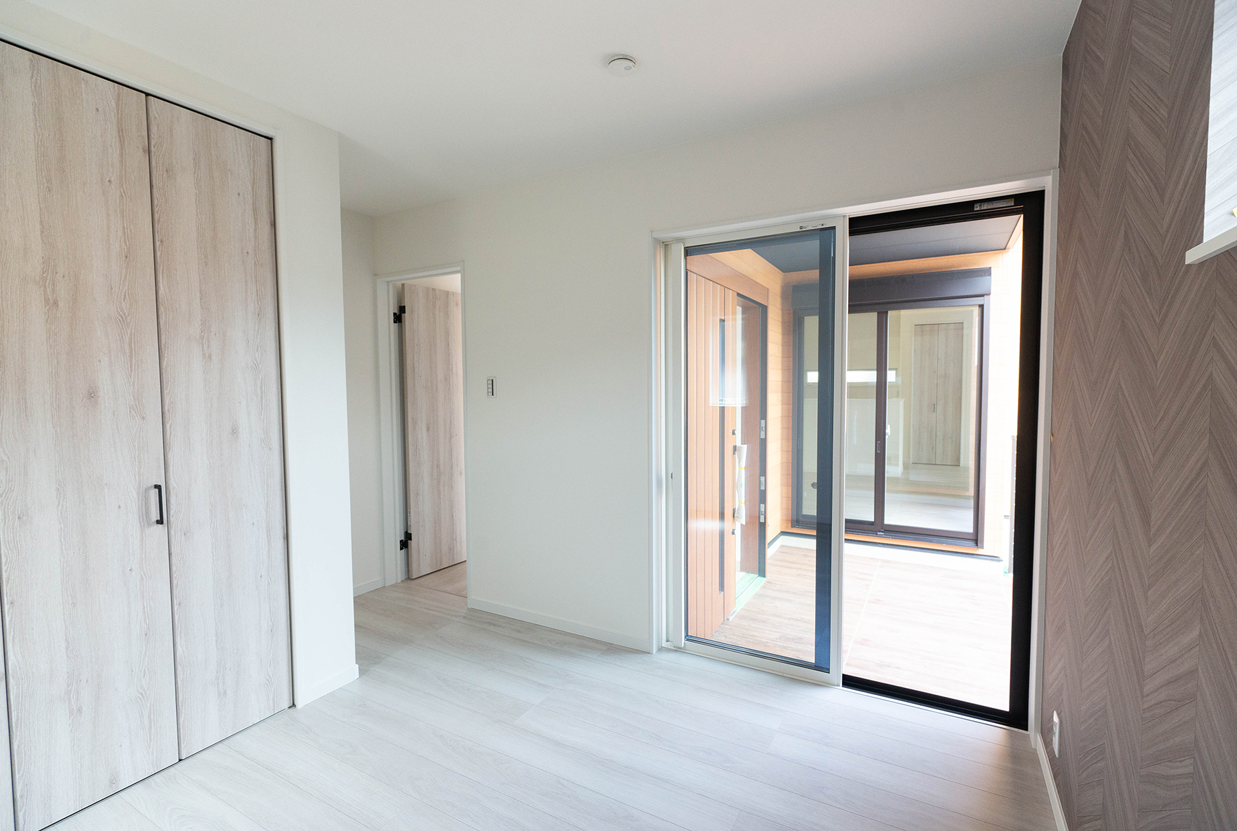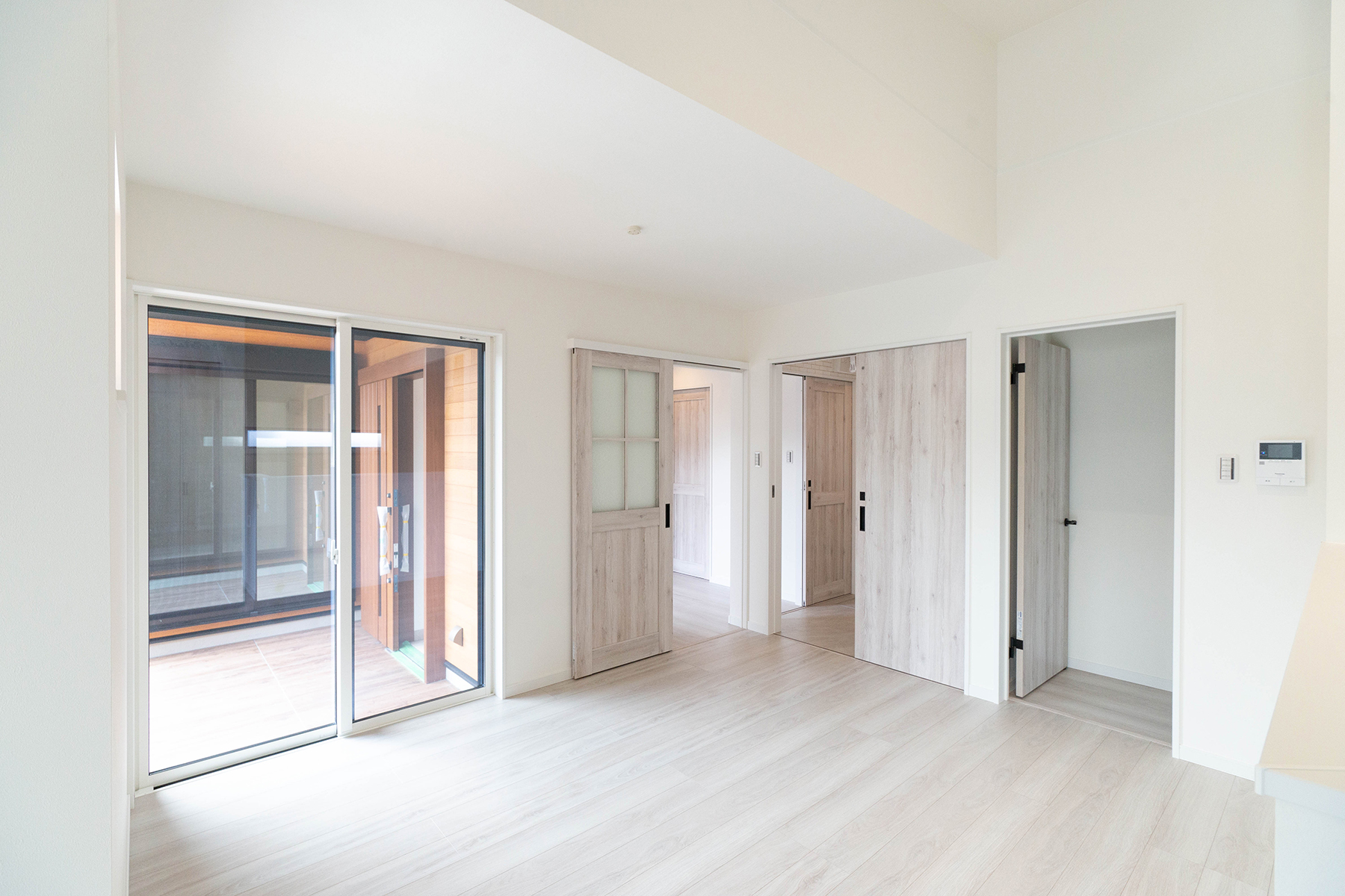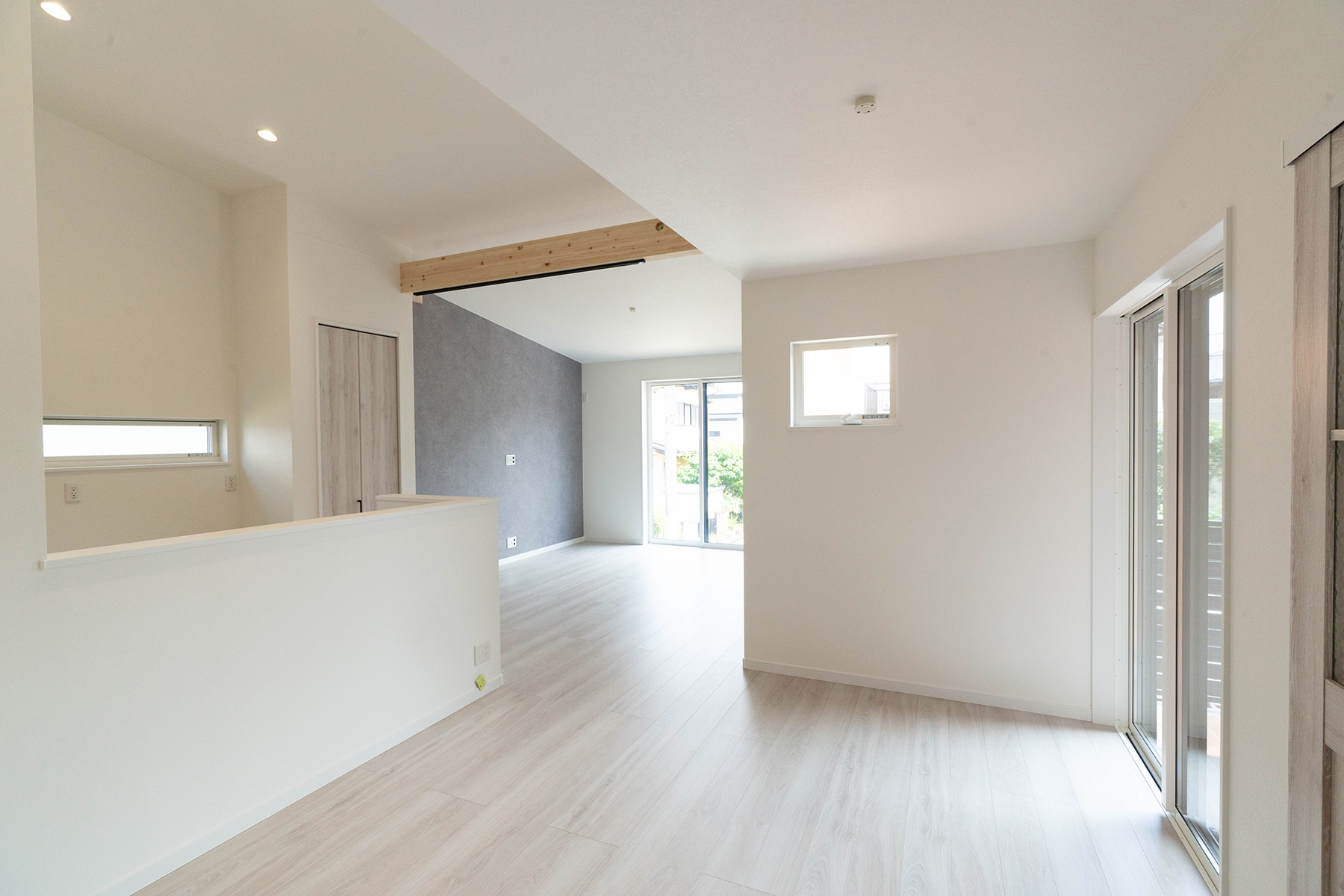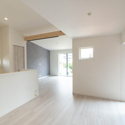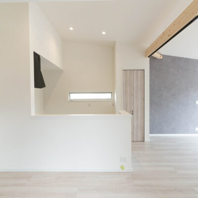 勾配天井がゆとりある開放感を演出。 白と木目を基調とした色使いが、家族を包み込むような温かい空間に。