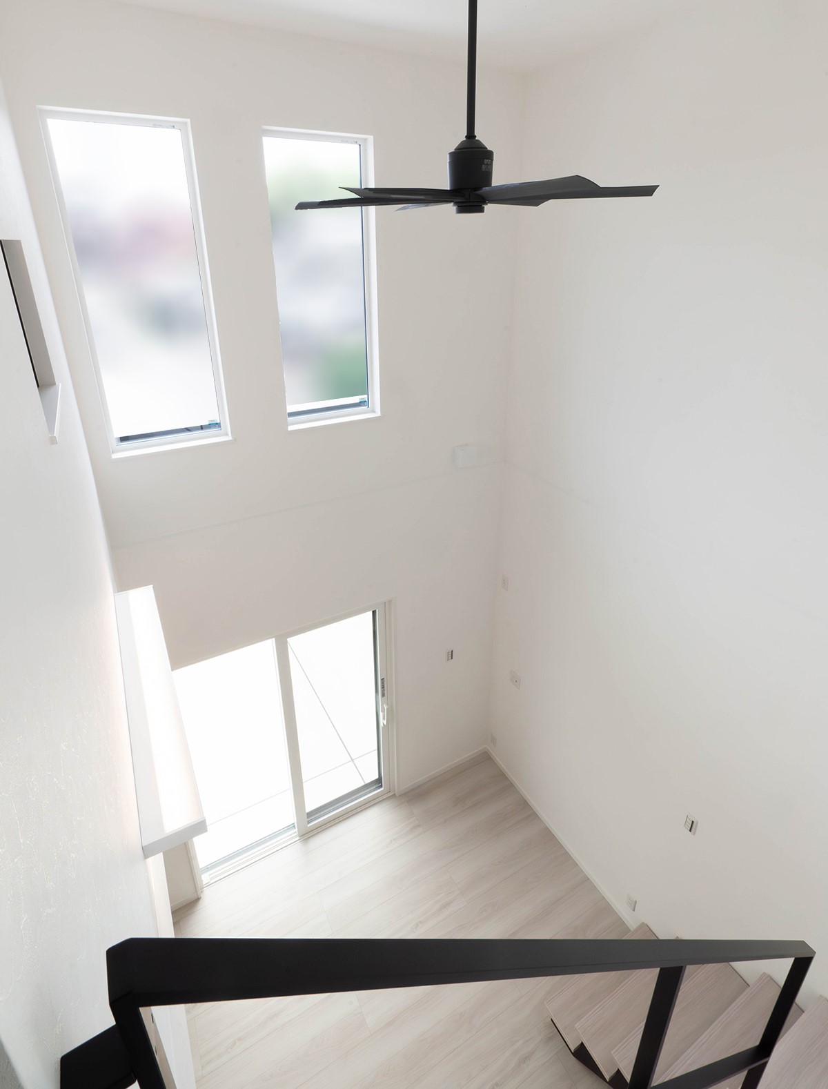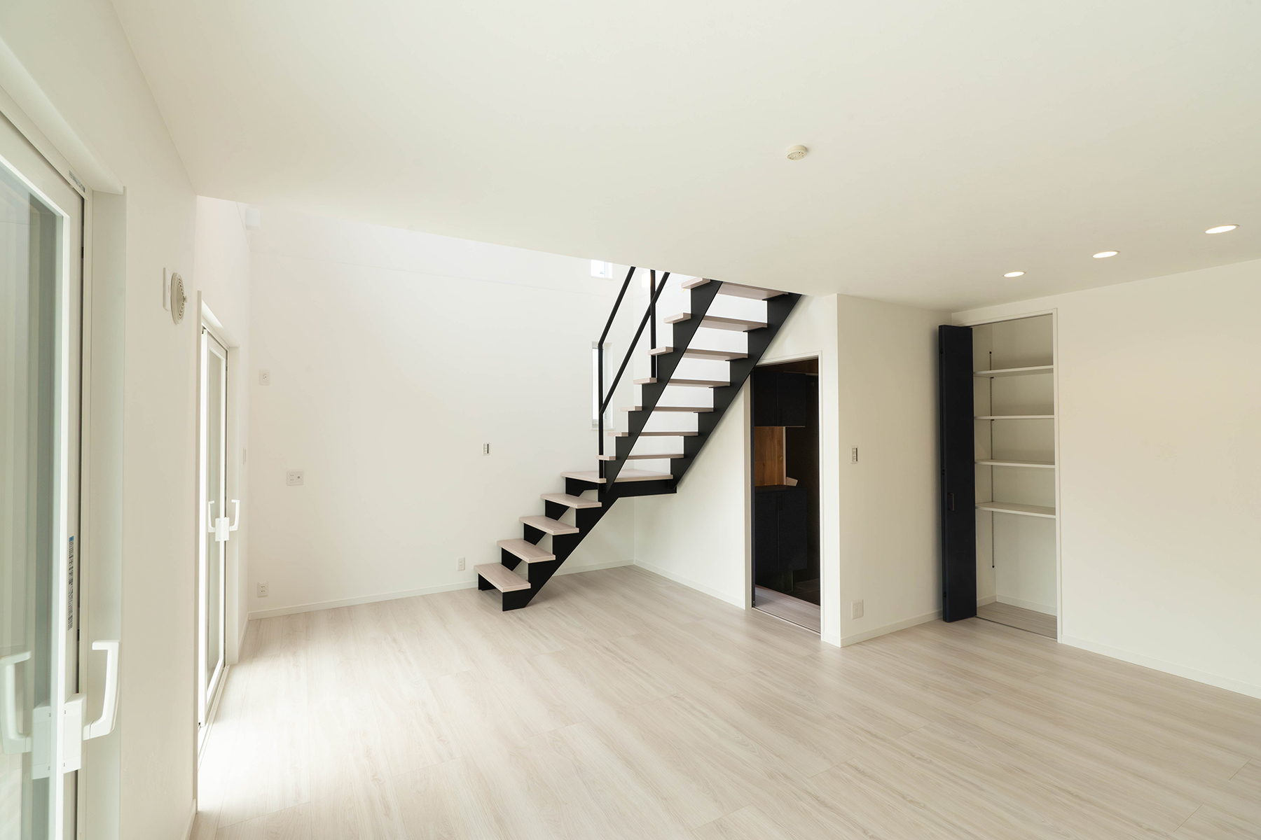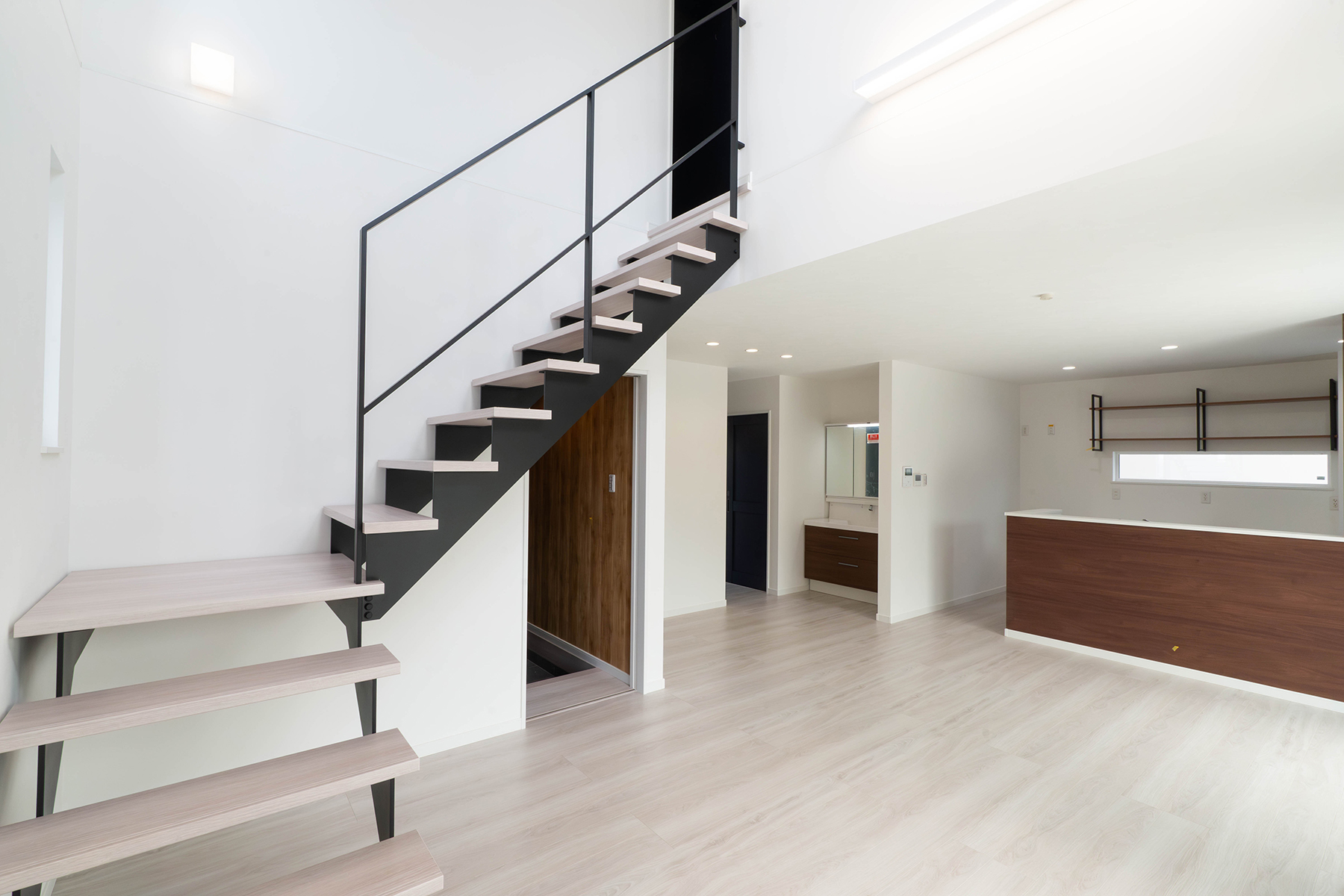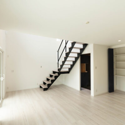 吹抜けに映えるスケルトン階段が、リビングに光と開放感をもたらします。