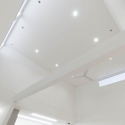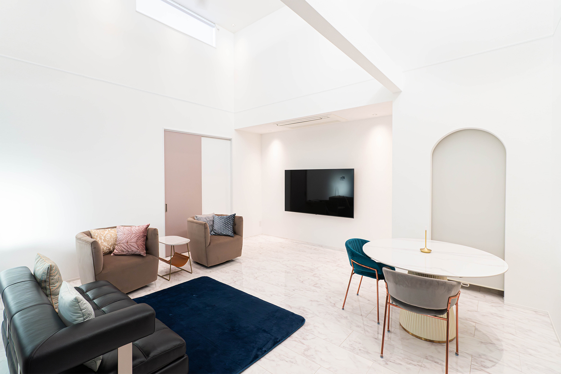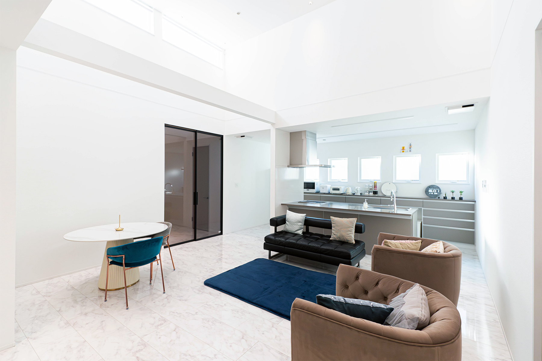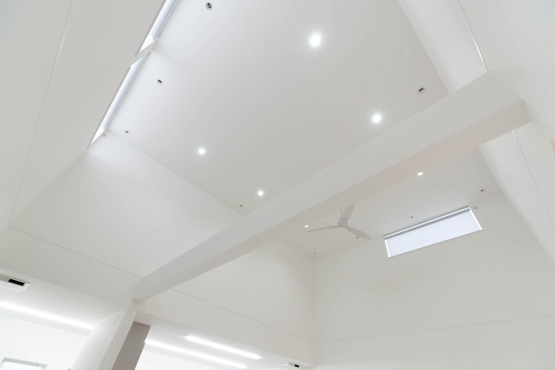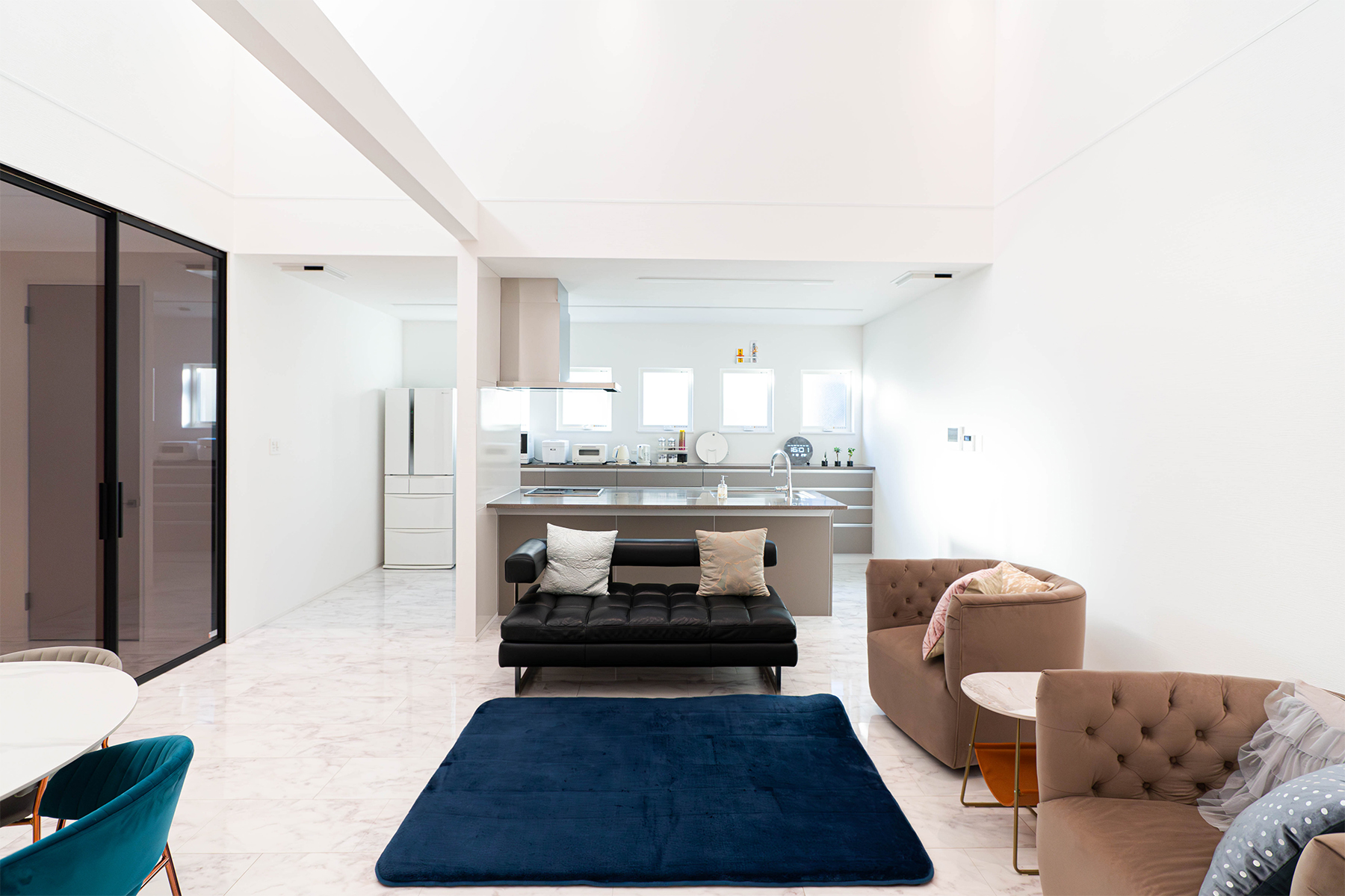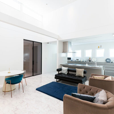 壁と天井を白で統一したリビングは、吹抜から入る光を美しく反射し気品あふれる開放感を演出します。