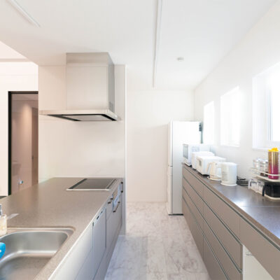 複数の窓から光が差し込む明るいキッチンは家電のトーンを揃え、洗練された印象に。