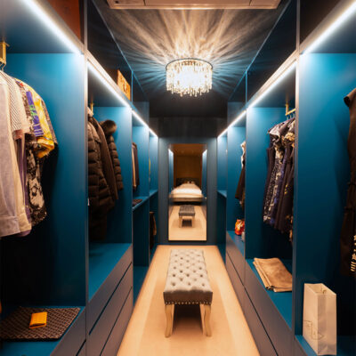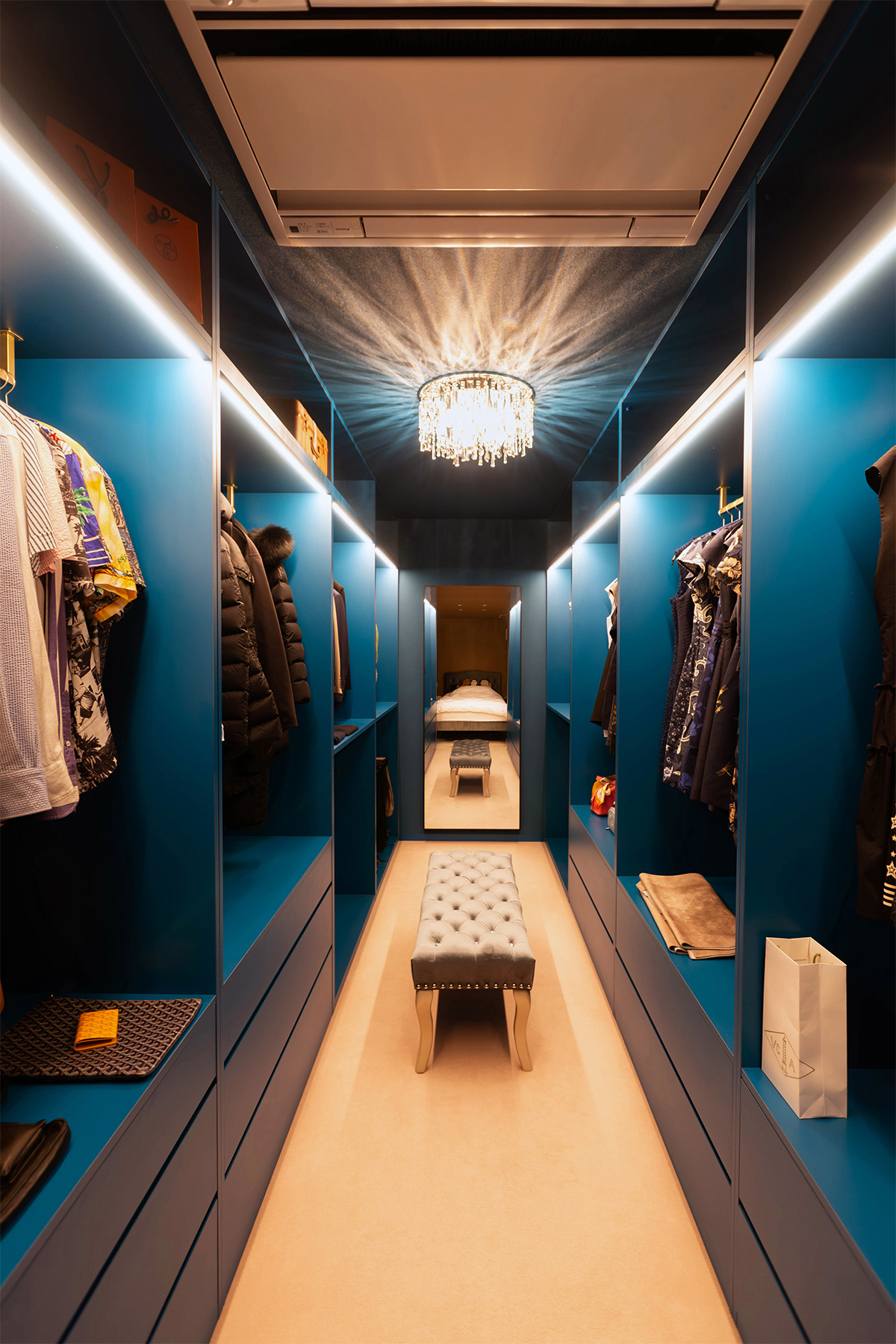 寝室横にはこだわりの照明と大きな鏡を備えたウォークインクローゼット。