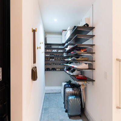 玄関横のシューズクロークはお気に入りの靴を美しく並べる「魅せる収納」としてデザインしました。