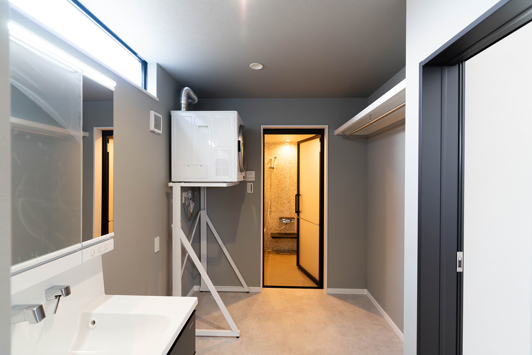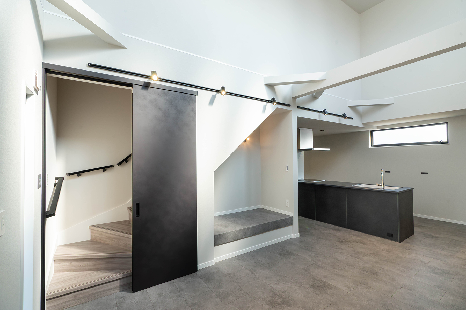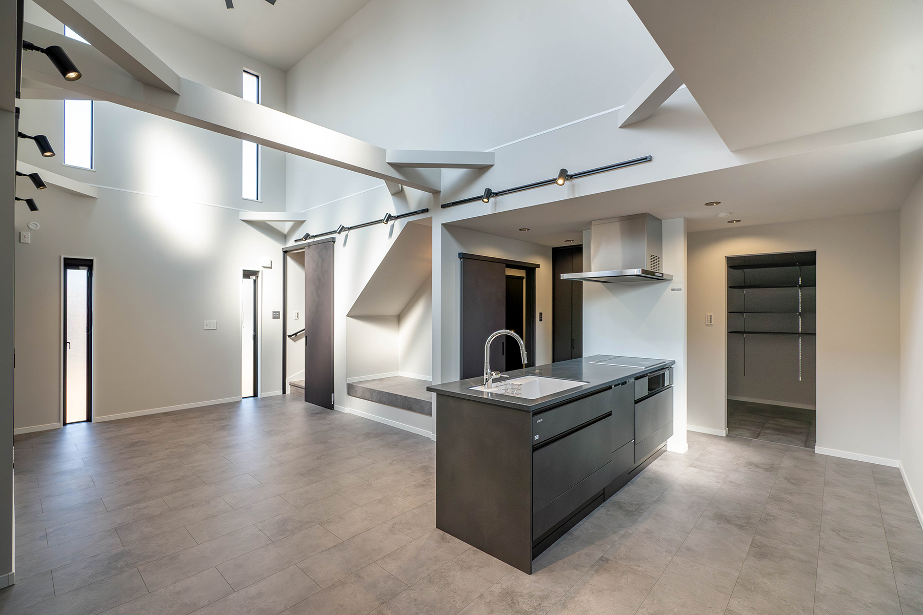 斜めに設けた段差ラインが視線を奥へと導き、空間に広がりを感じさせます。