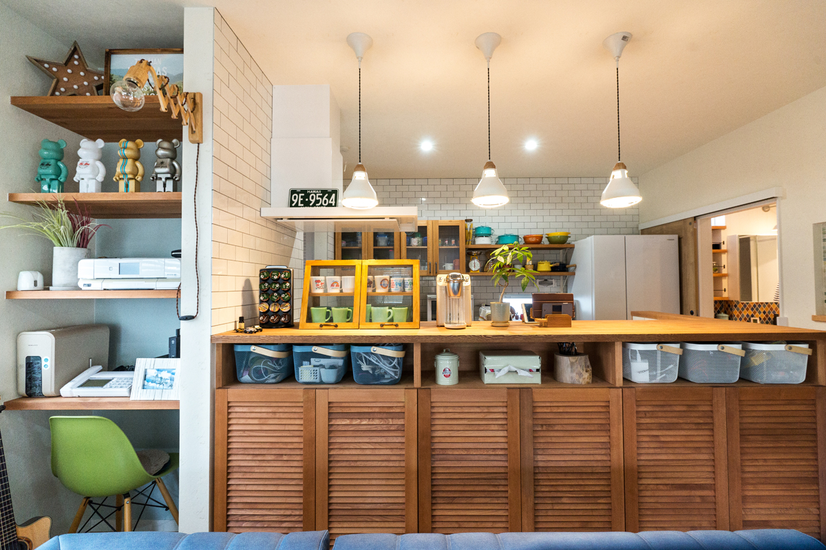 見せ収納と終い勝手が良い引き収納が合わさったウッディーなキッチン裏の収納カウンター。