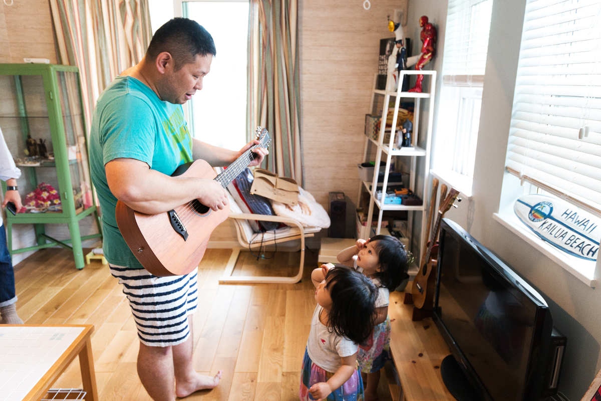 「ようやくギターが役に立ちましたね」とにっこりするパパはいつも子どもの歌を弾き語りながら西海岸の風が吹く素敵な空間で一緒に遊ばれているようです。