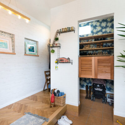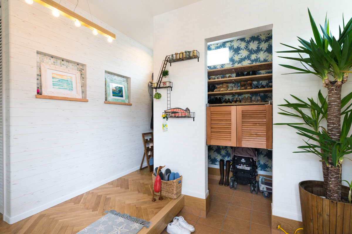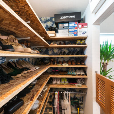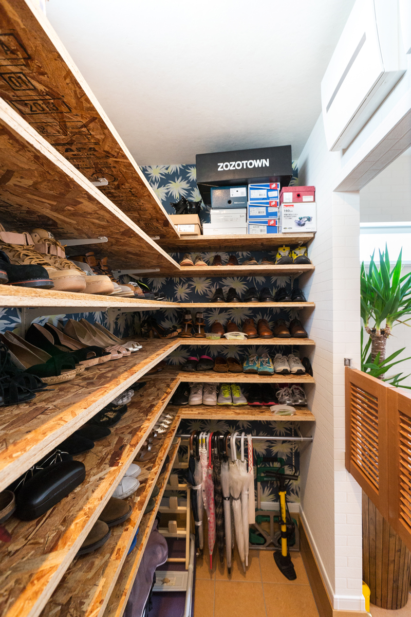 例えば、シューズクロークやW.I.CにはOSBパネルを使用し、造作で靴置きや小物収納ができる棚を。