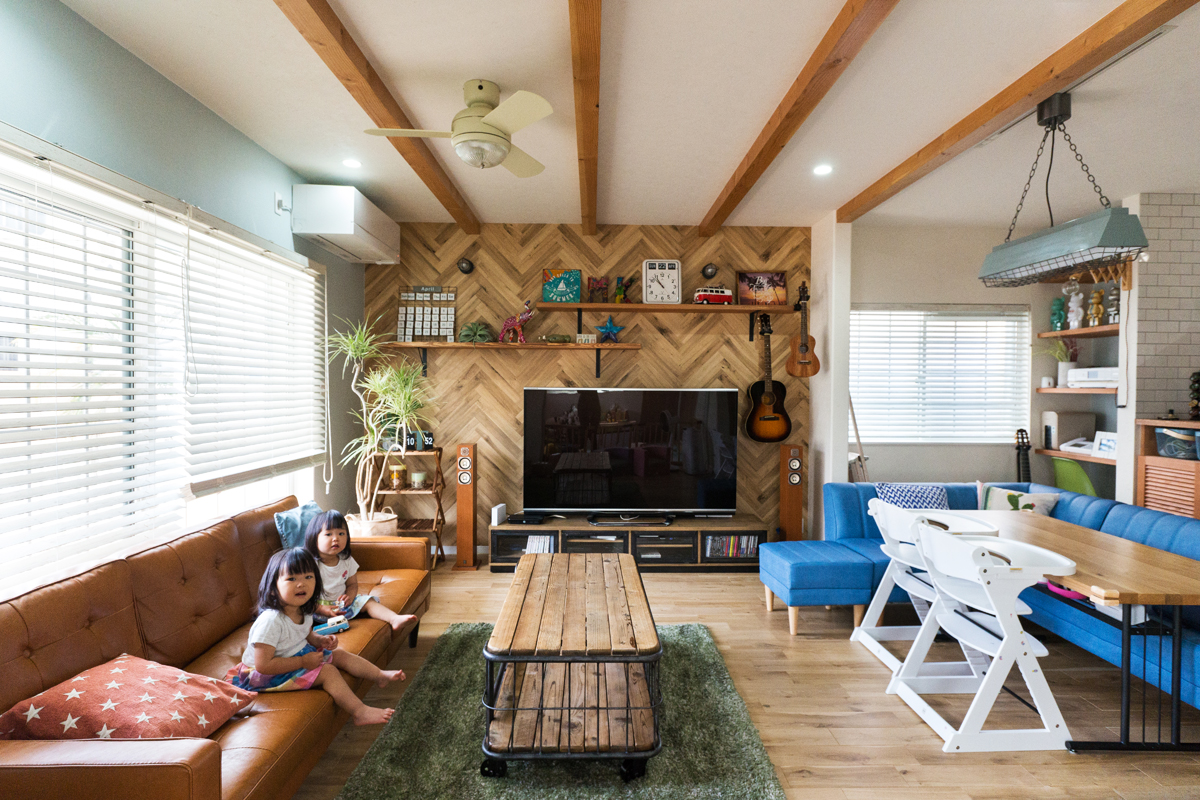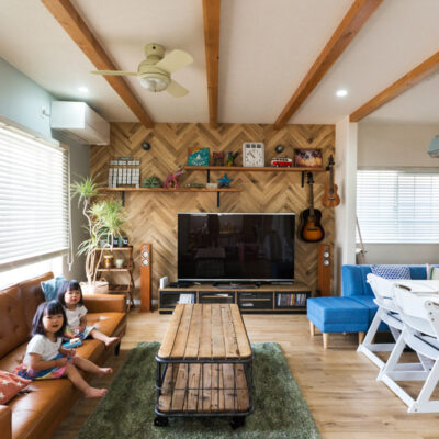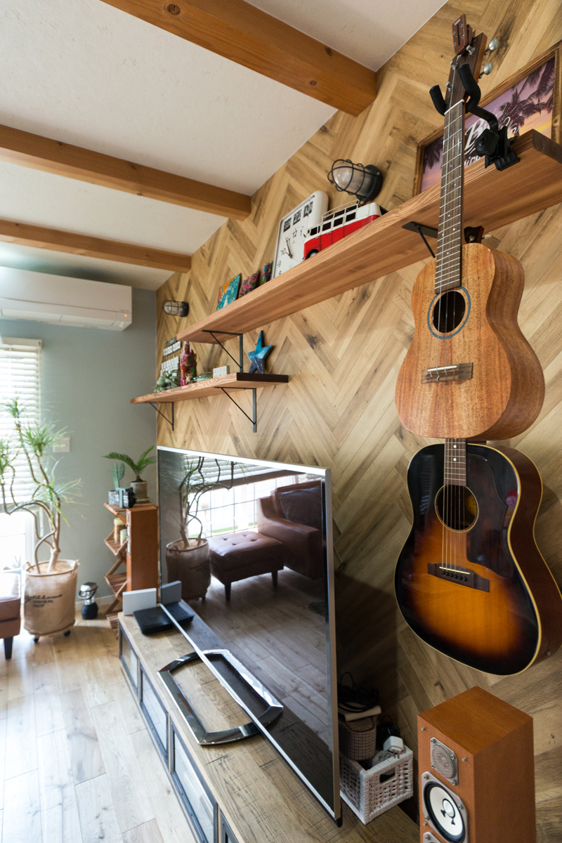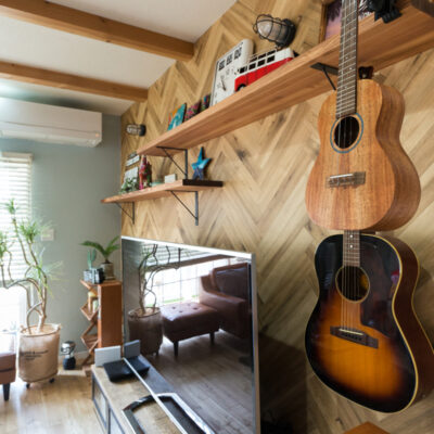 リビング壁のヘリンボーンは高級感と上品さがありながら親しみが感じられる