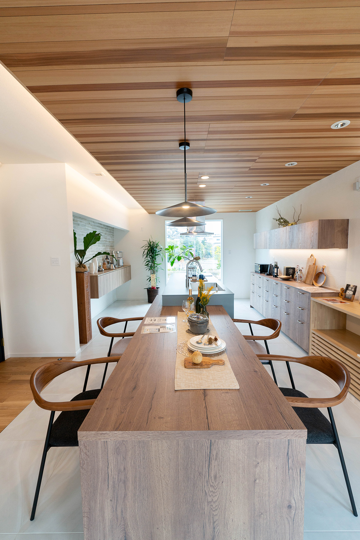 アイランドキッチンとダイニングが一体化しており、配膳がスムーズで家族一緒に料理を楽しめる工夫が詰まった空間です。