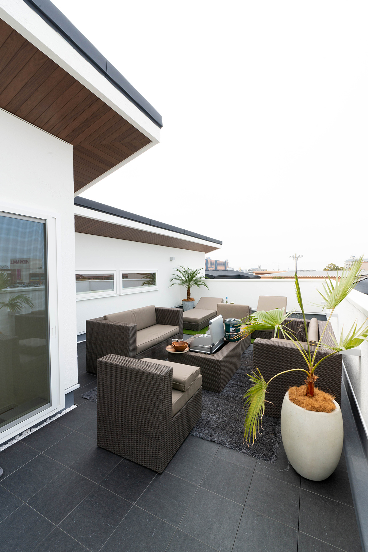 家に居ながら屋上でリゾート気分を味わう事ができるスカイテラスは家族だけのプライベート空間。