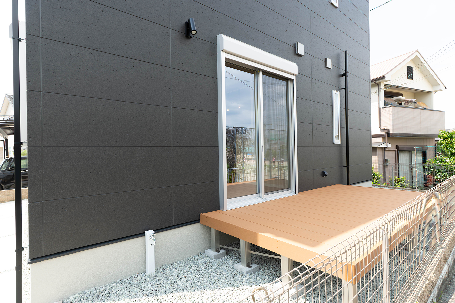 東向きで朝陽が入り、昼は涼しく過ごせる快適空間のウッドデッキ。