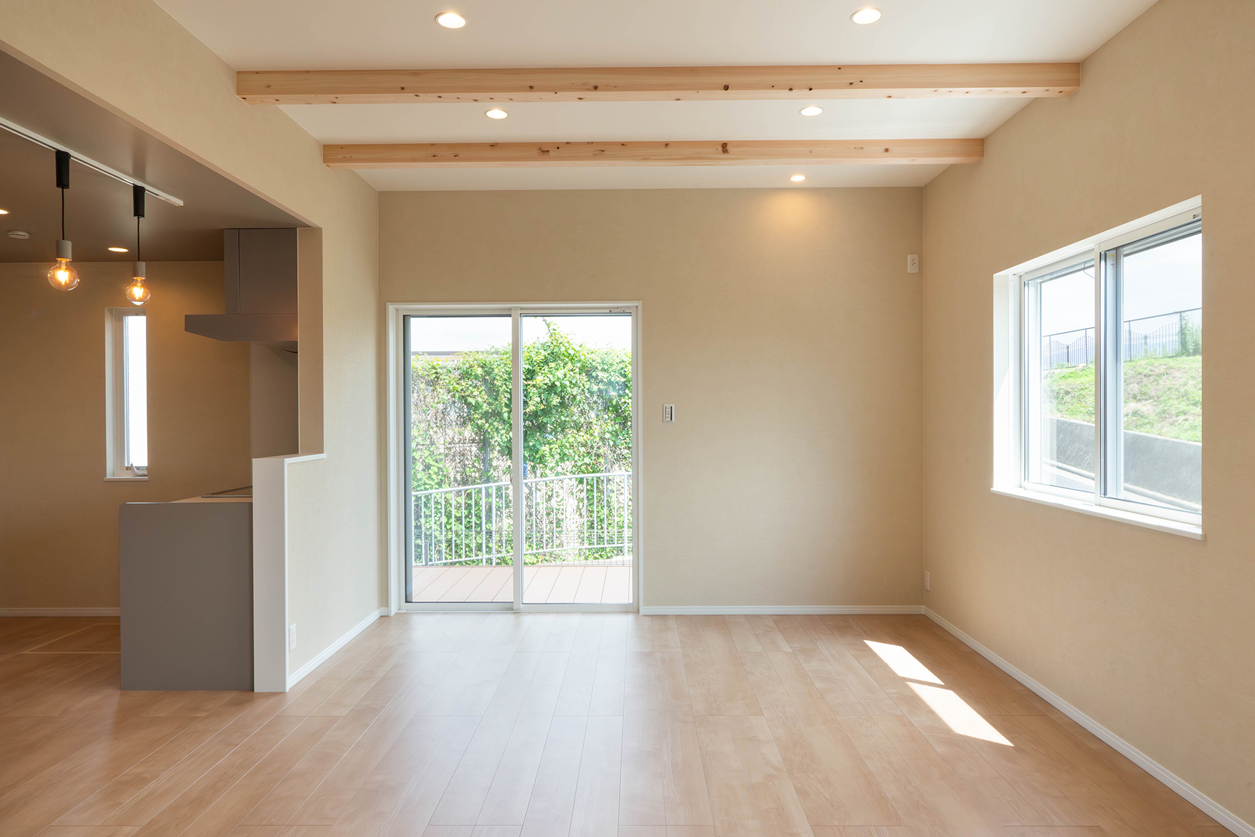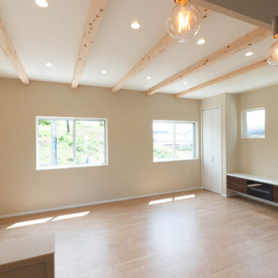 20帖の広々LDKはウッドデッキとつながり、見せ梁天井が空間をおしゃれに演出。