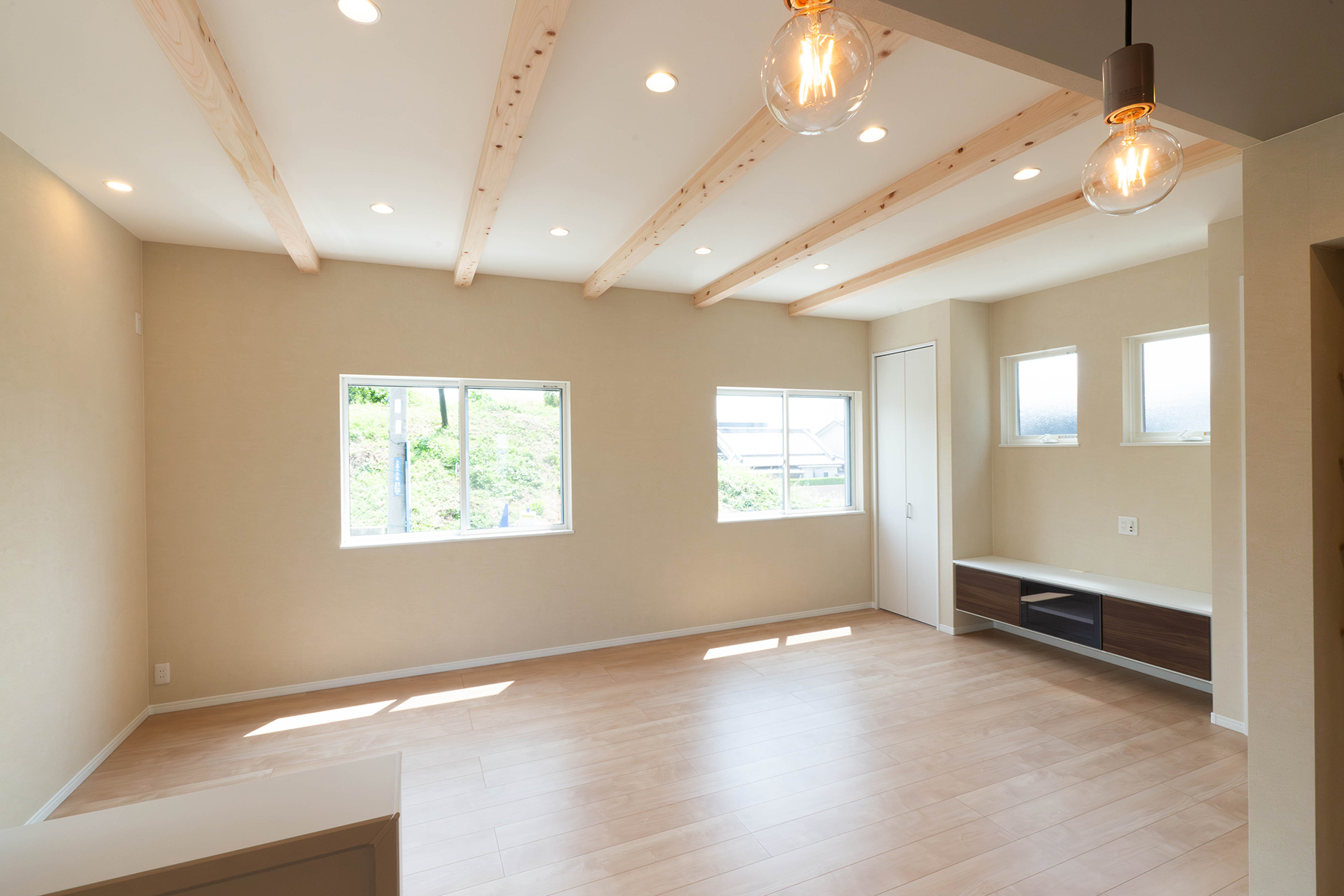 備え付けのテレビボードと両脇の収納で、リビングがすっきり片付き、使いやすさも抜群です。
