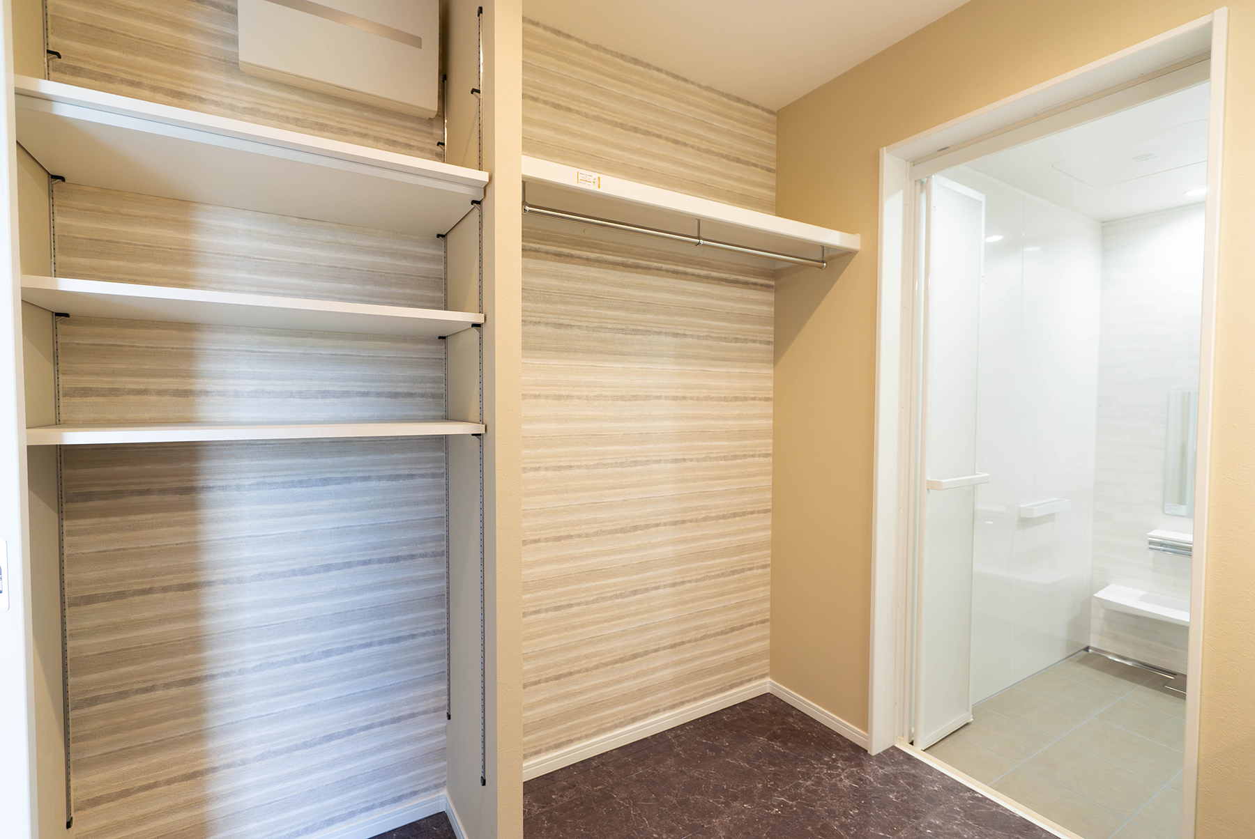 洗面脱衣室にはハンガーパイプと可動棚で収納自在の便利なリネン収納スペース。