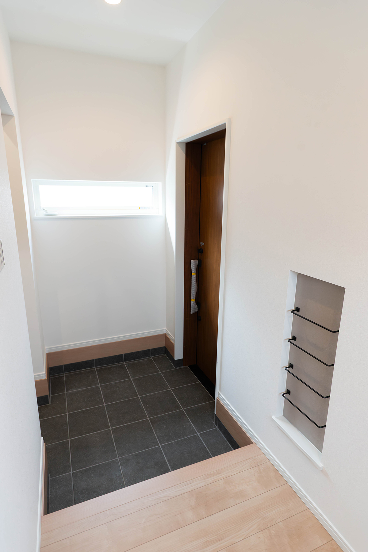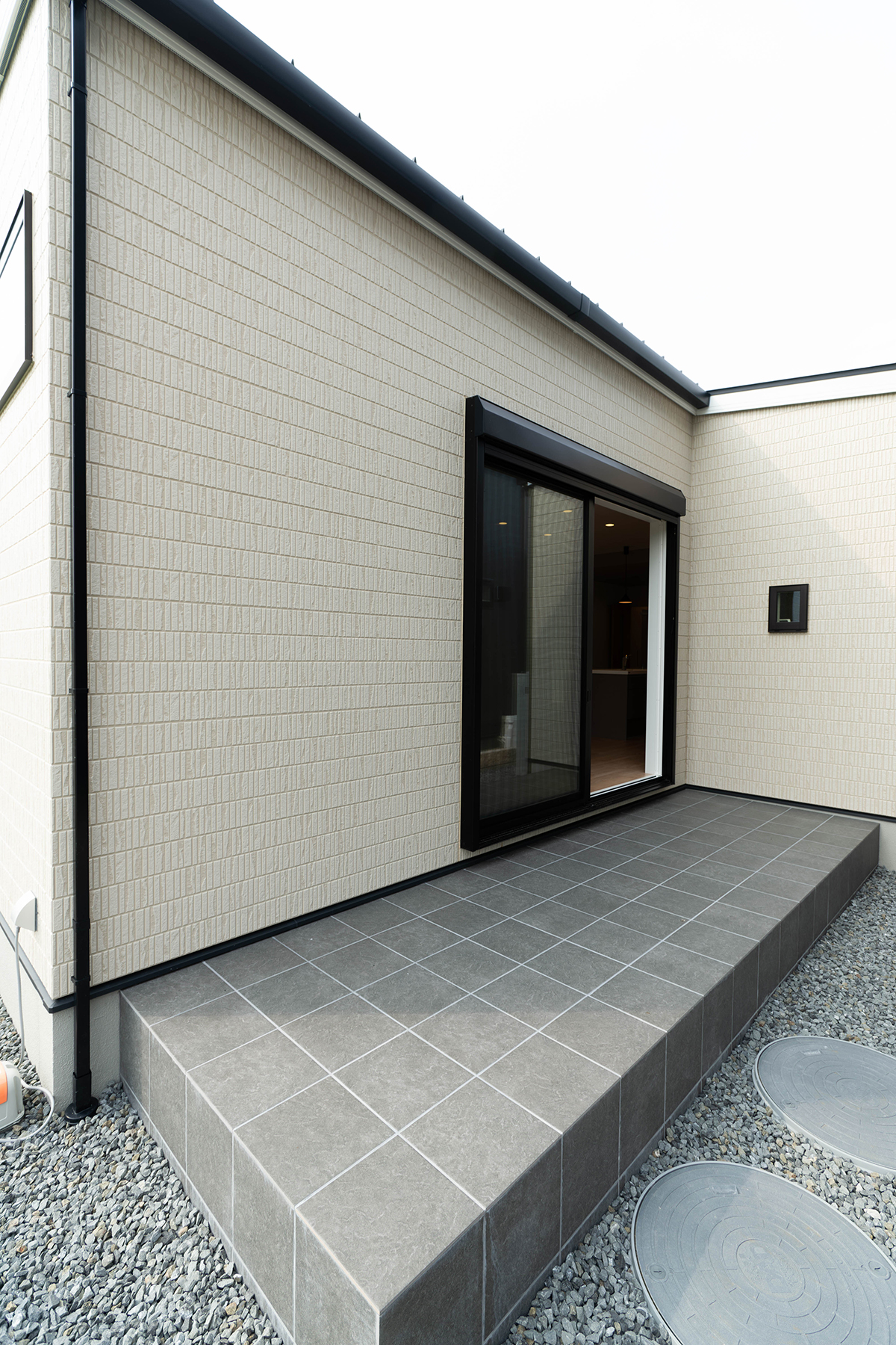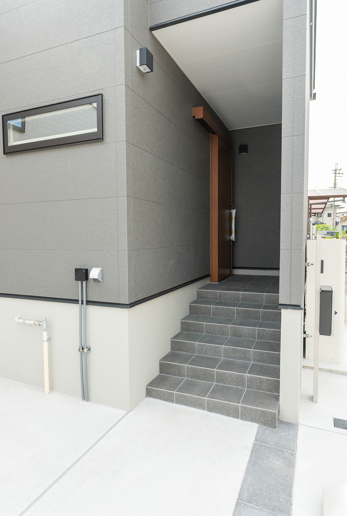 玄関ポーチが広く使える片引き戸で屋根もあるので雨の日でも出入りしやすくなっています。前からの視線も入りにくくしているのでプライバシー性も高くなっています。