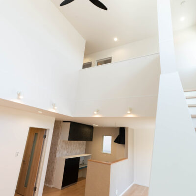 吹き抜け天井とシーリングファンで、明るく快適なリビング空間。