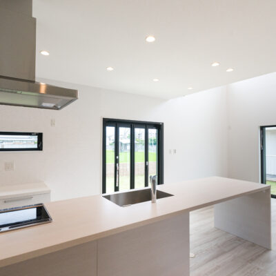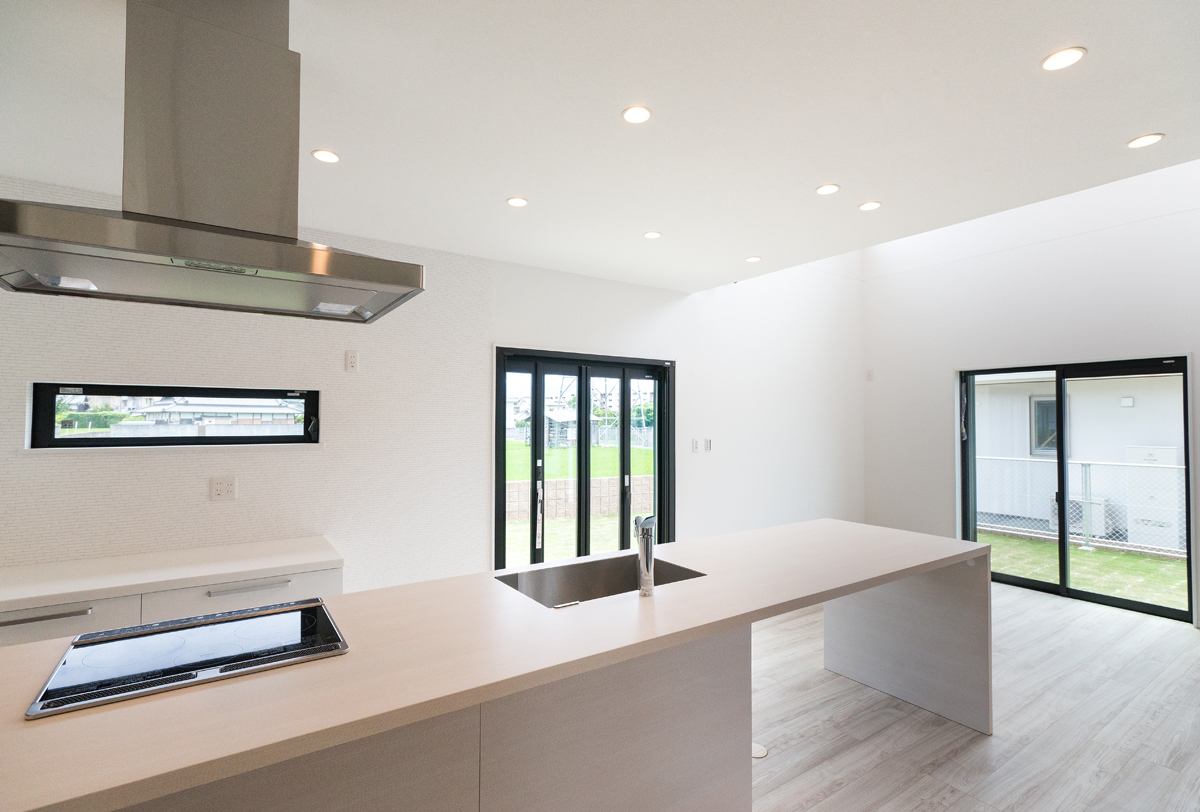 N様邸 キッチンから庭へと続く大開口の窓◎アウトドアリビングが魅力的な邸宅
