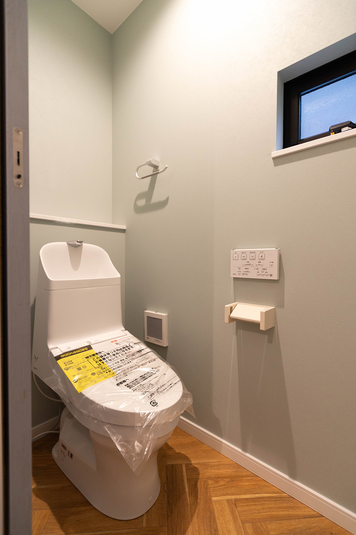洗面所の淡いグリーンの縦ストライプが、清潔感と可愛らしさを演出しています。