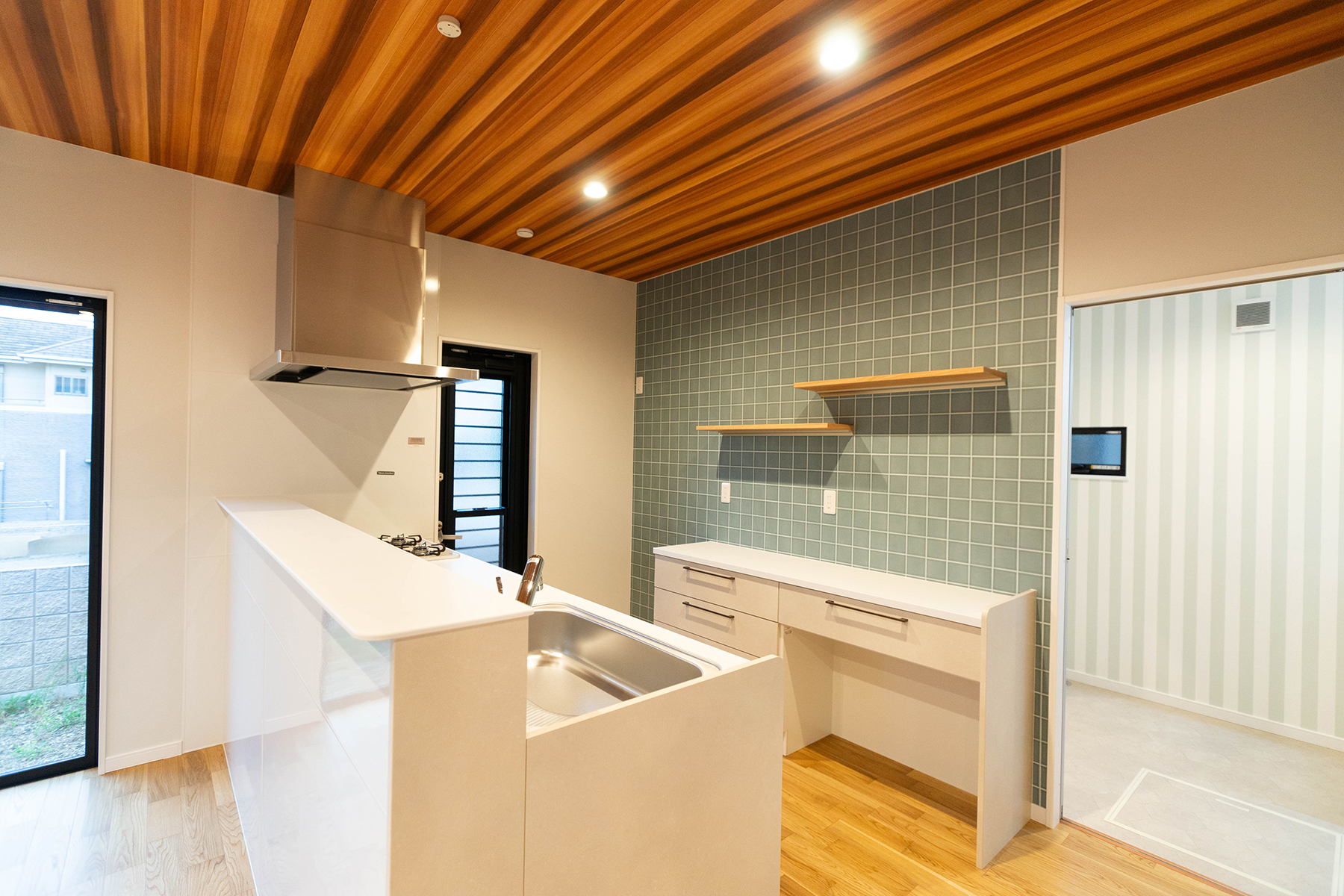 一番に目を引く、キッチンからリビングにかけて続く木目天井の直線のラインが奥行きを強調し