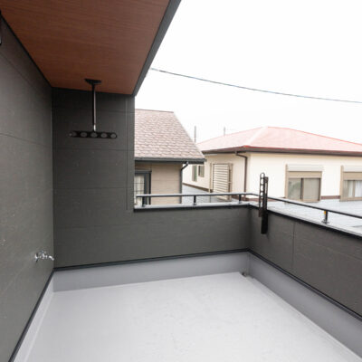 2階ホールに設置された黒のアイアンバーの室内物干しは、現代の暮らしに嬉しい実用的な空間です。