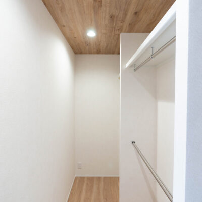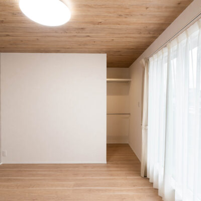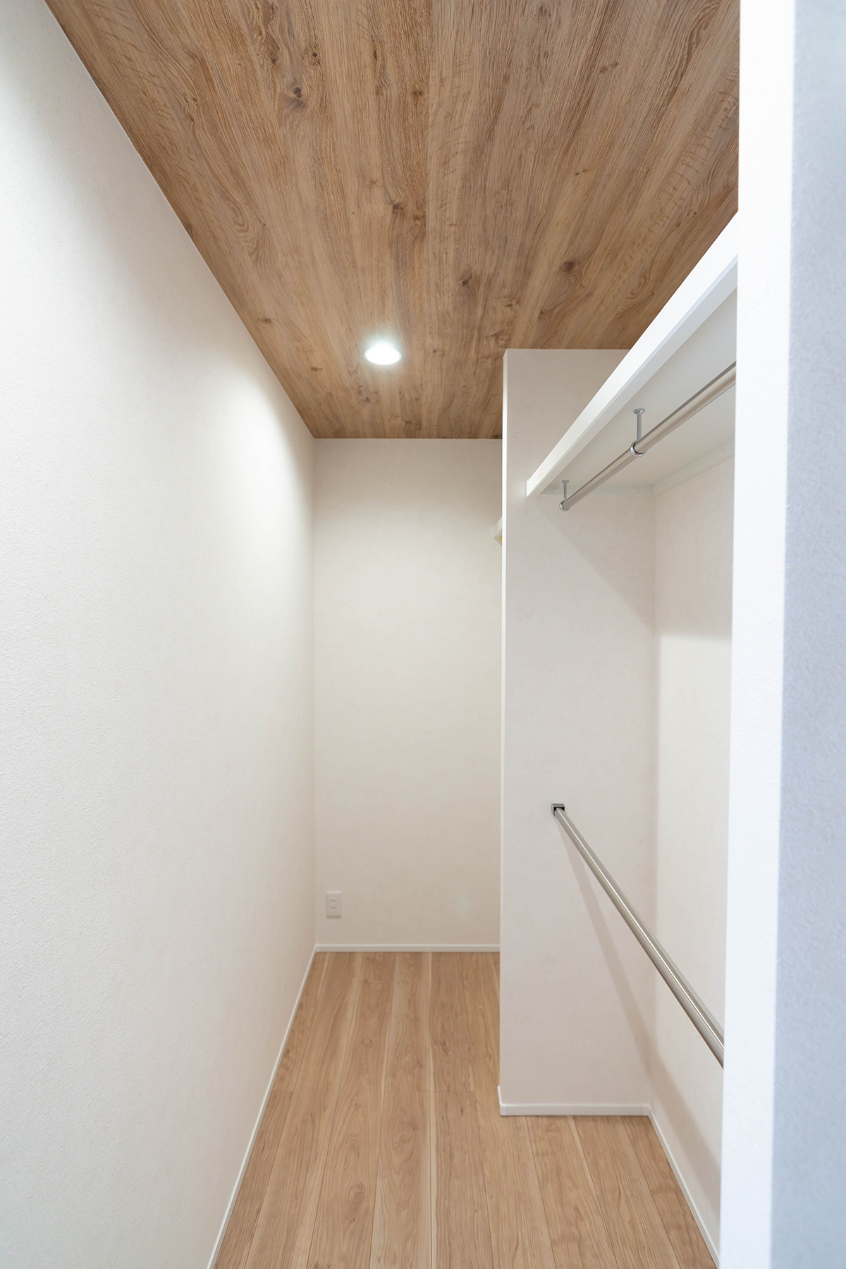 扉のないオープンなWICとの仕切り壁が、天井の木目を遮ることなく奥行きを感じさせます。