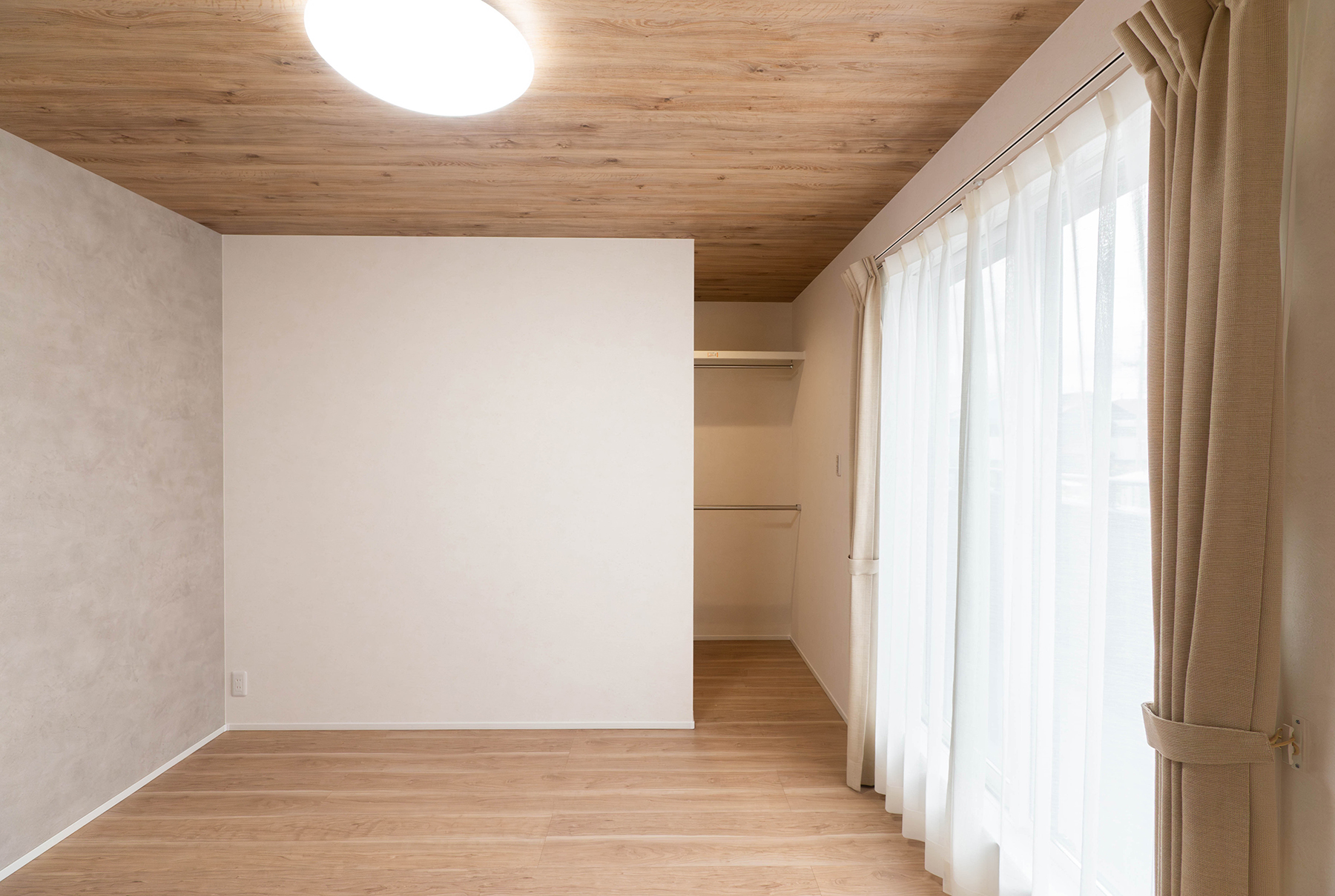 天井に木目調のクロスをあしらった、リラックス感あふれる主寝室