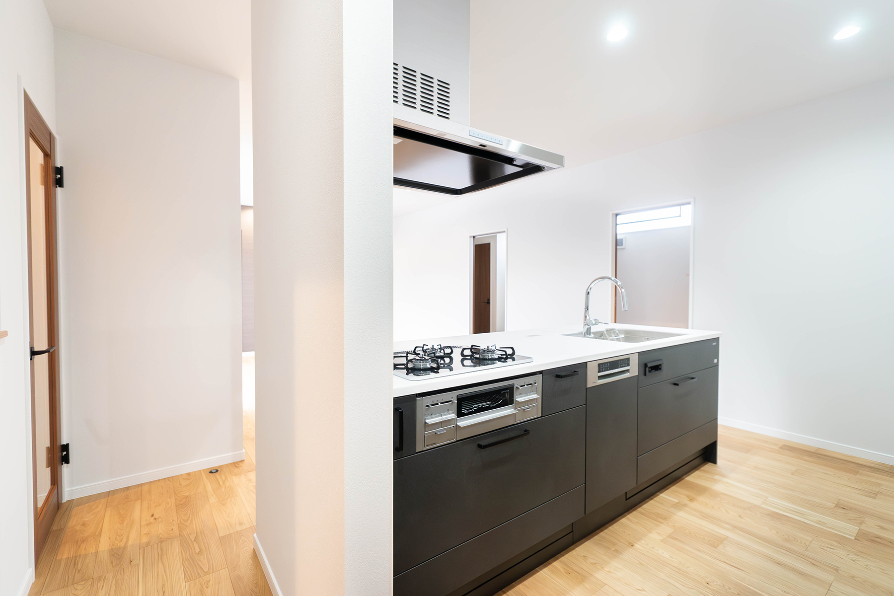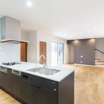 木目の温かみと深い色のキッチンが調和したモダンなLDK。