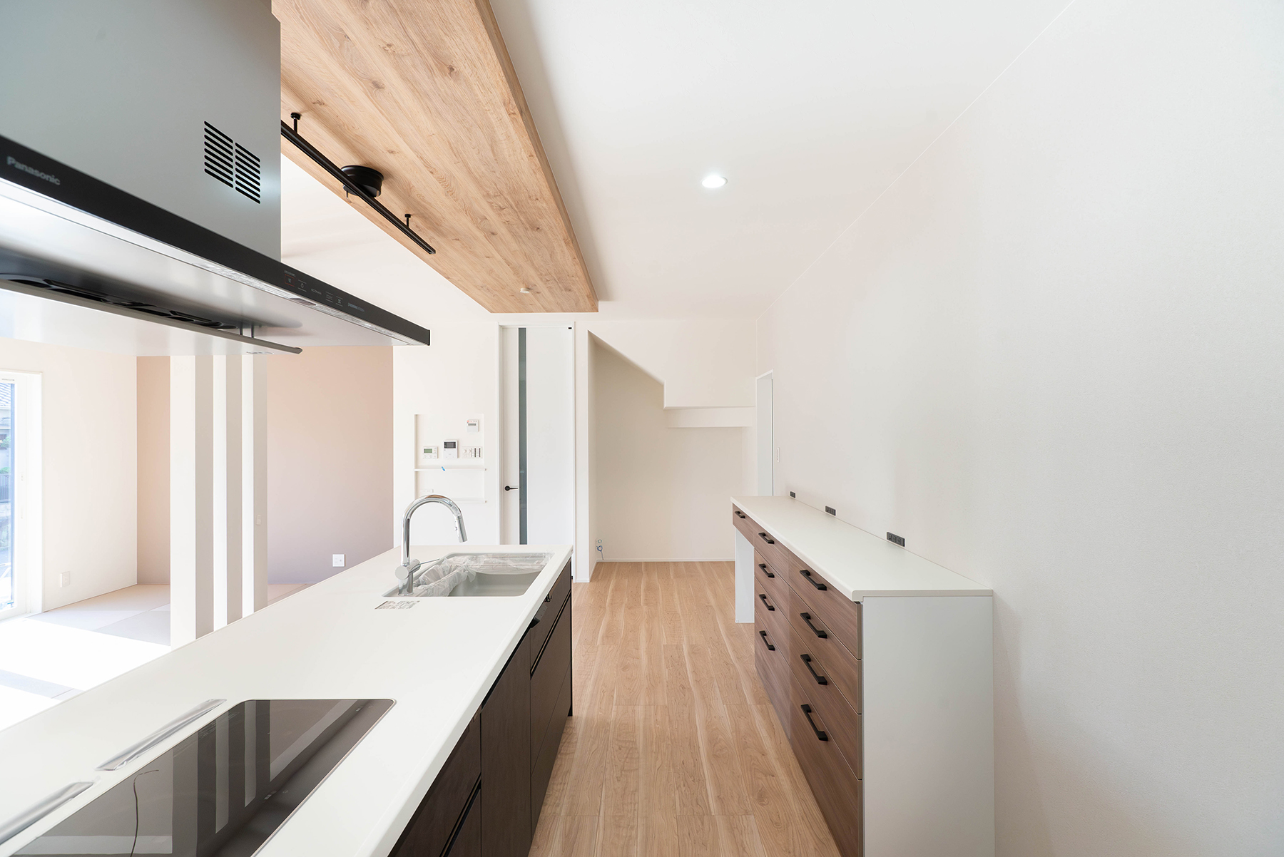 アイランドキッチンと吹抜けを組み合わせることで、光と視線が抜ける開放感のあるLDKを構成しています。